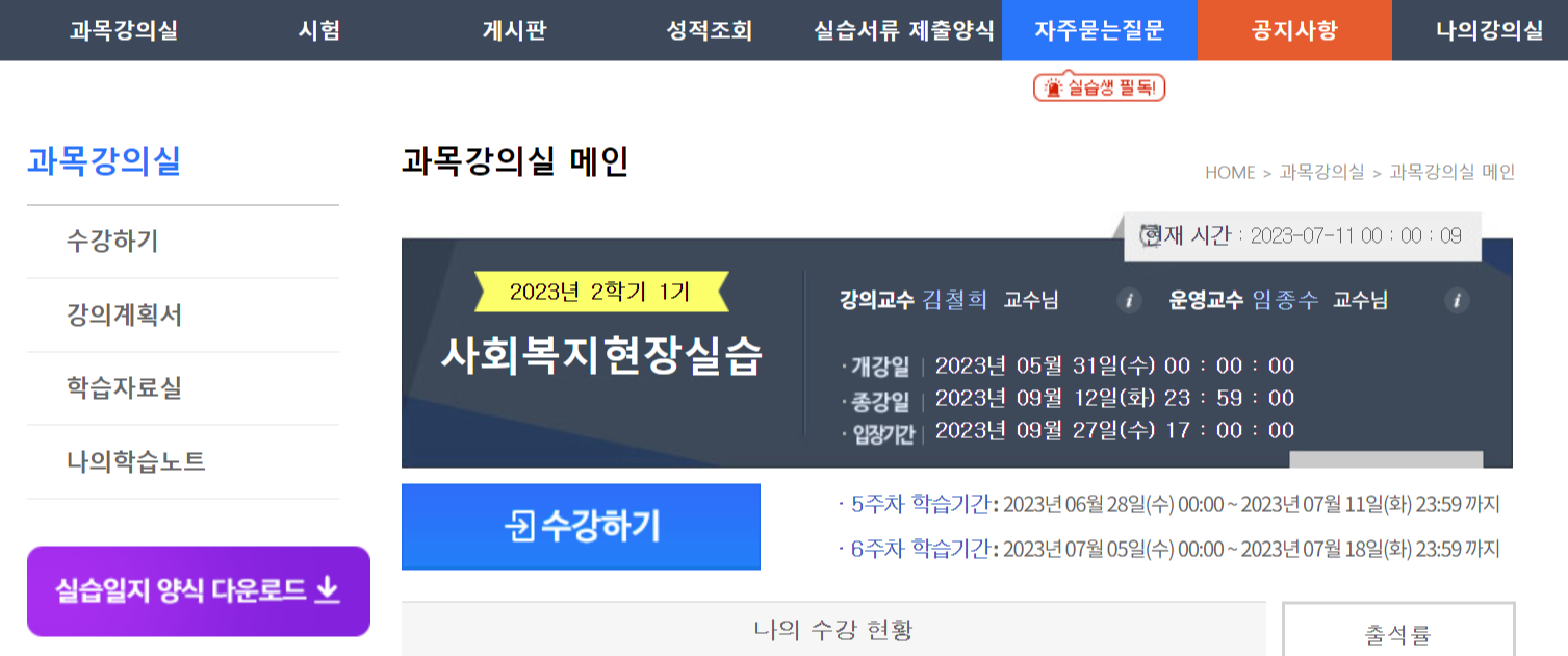 아래는 제가 수강하고 있는 교육원 사이트입니다. 수강하는 강의에 들어가시면 실습일지 양식 다운로드가 있습니다. 클릭하시면 제출서류를 입력할 수 있습니다.